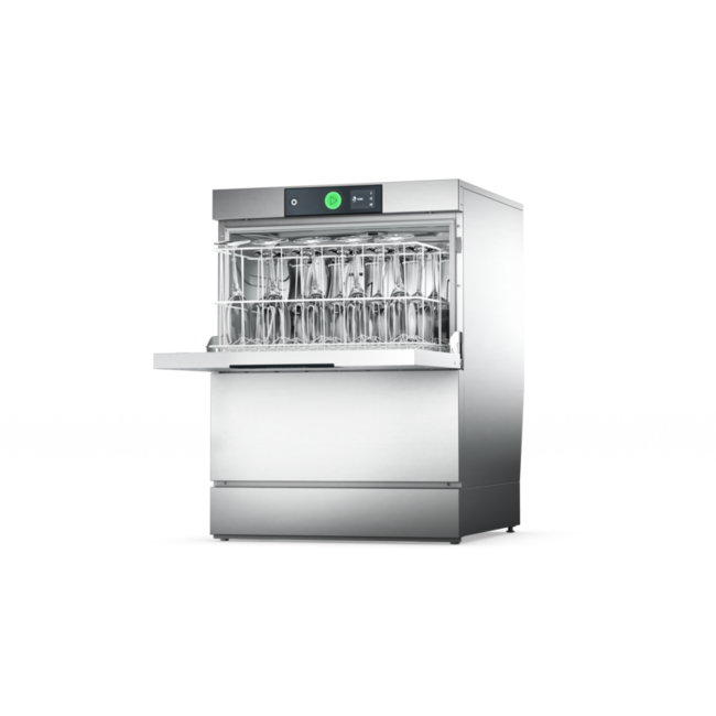 Compacte glazenwasmachine: met een installatiehoogte van slechts 705 mm is hij ideaal voor krappe plaatsen en met installatiehoogte van 820 mm bij een geïntegreerde omgekeerde osmose is hij ook ideaal voor installetie onder de bar.